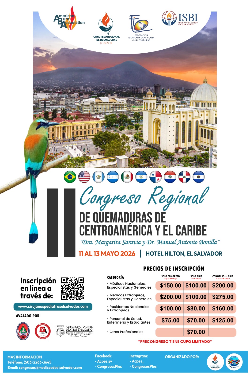 Compra tu inscripción en línea y participa en el II Congreso Regional de Quemaduras de Centroamérica y el Caribe. El evento reunirá a especialistas, residentes y profesionales de la salud en un entorno seguro, con opciones de hospedaje cercanas y tarifas preferenciales para que tu estadía sea cómoda y productiva. El Salvador te espera con todo su atractivo cultural.